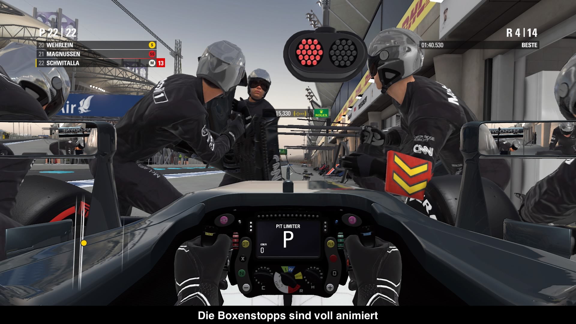 F1 2016 ist natürlich ein reinrassiges Rennspiel mit hochgezüchteten Rennfahrzeugen. Diese lassen sich vor allem mit einem Lenkrad erstaunlich gut und präzise über die Rennstrecke jagen und es macht wirklich Spaß mit dem Fahrzeug zu kämpfen. Mit dem Controller sieht die Sache schon etwas komplizierter aus. Hier fehlt etwas die Präzision in der Lenkung, die man bei den hohen Geschwindigkeiten vermisst. Wer sich dann noch entscheidet die Traktionskontrolle abzuschalten, hat wirklich zu kämpfen da jeder zu frühe Tritt aufs Gaspedal bestraft wird. Mit Controller ist dies dann etwas frustrierend. Aber allgemein ist die hohe Anzahl an Fahrhilfen positiv zu sehen. Es gibt natürlich das ESP, aber auch eine Bremshilfe, diverse Fahrlinienhilfen usw. So kann sich jeder seine passenden Einstellungen zurechtlegen. Gleiches gilt auch für die Renneinstellungen, z.B. in der Karriere. Man kann z.B. die KI-Kompetenz, die Länge des Qualifying oder die Renndistanz einstellen und das von Rennwochenende zu Rennwochenende, sodass sich das Spiel an die eigenen Anforderungen jederzeit anpasst, wenn man möchte. Das ist wirklich etwas, wovon andere Spiele sich eine Scheibe abschneiden könnten.