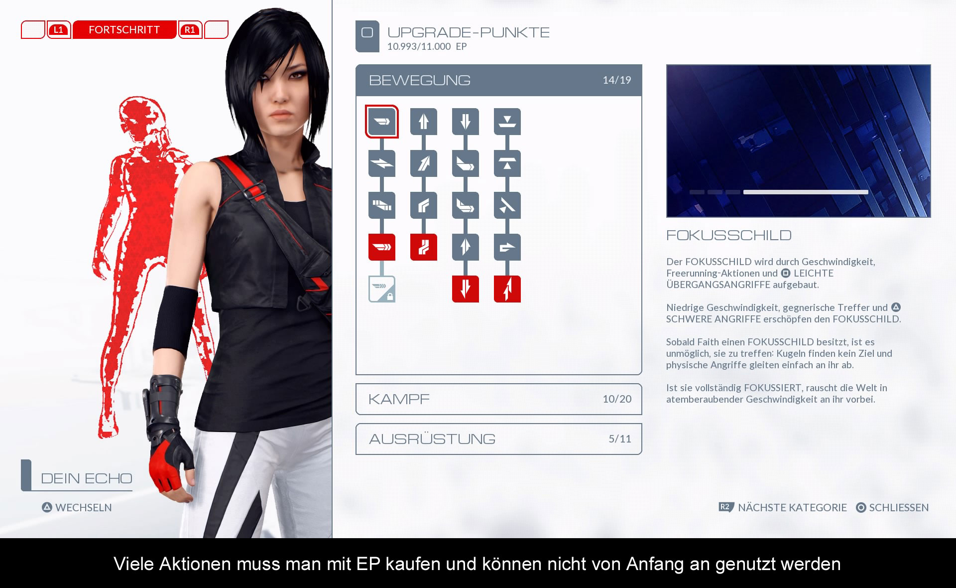Spielerisch hat sich im direkten Vergleich zum Vorgänger nicht viel getan. Noch immer muss man gekonnt über Abgründe springen, Rohre hochklettern, durch Tunnel krabbeln und so weiter und so fort. Natürlich, ohne dass man alle drei Meter auf die Nase fällt, deshalb sollte man seine Aktionen immer gut timen – dann füllt sich auch das neue Fokus-Meter. Dadurch wird Faith kaum langsamer. Das ist am Anfang durchaus tricky, aber sobald man den Dreh raus hat, hilft einem das Feature ungemein. Zumindest wenn man einige „Moves“ von Faith bereits freigeschaltet hat, denn am Anfang ist die gestählte Runnerin wie ein Renn-Azubi und kann nicht viel. Da das Gameplay aber das Hauptargument für das Spiel ist, hätte man das besser lösen müssen. Denn zu Beginn sind einfach zu viele Aktionen gesperrt. Eine weitere Neuerung ist der Greifhaken, mit dem man höher gelegene Stellen erreichen oder wie Tarzan über Abgründe schwingen kann. Nett, aber das weicht das Gameplay doch etwas auf, denn das Augenmerk sollte ja eigentlich darauf liegen, welchen Weg man als Spieler findet, um zum Ziel zu gelangen. Die Steuerung ist aber zumindest nochmals ein Stück griffiger geworden und nach kurzer Eingewöhnungszeit sollte niemand damit ein Problem haben. Trotzdem: Da man sehr - und ich wiederhole sehr oft - mal daneben springt, sollte man schon resistent gegenüber jeglichen Neustarts sein!