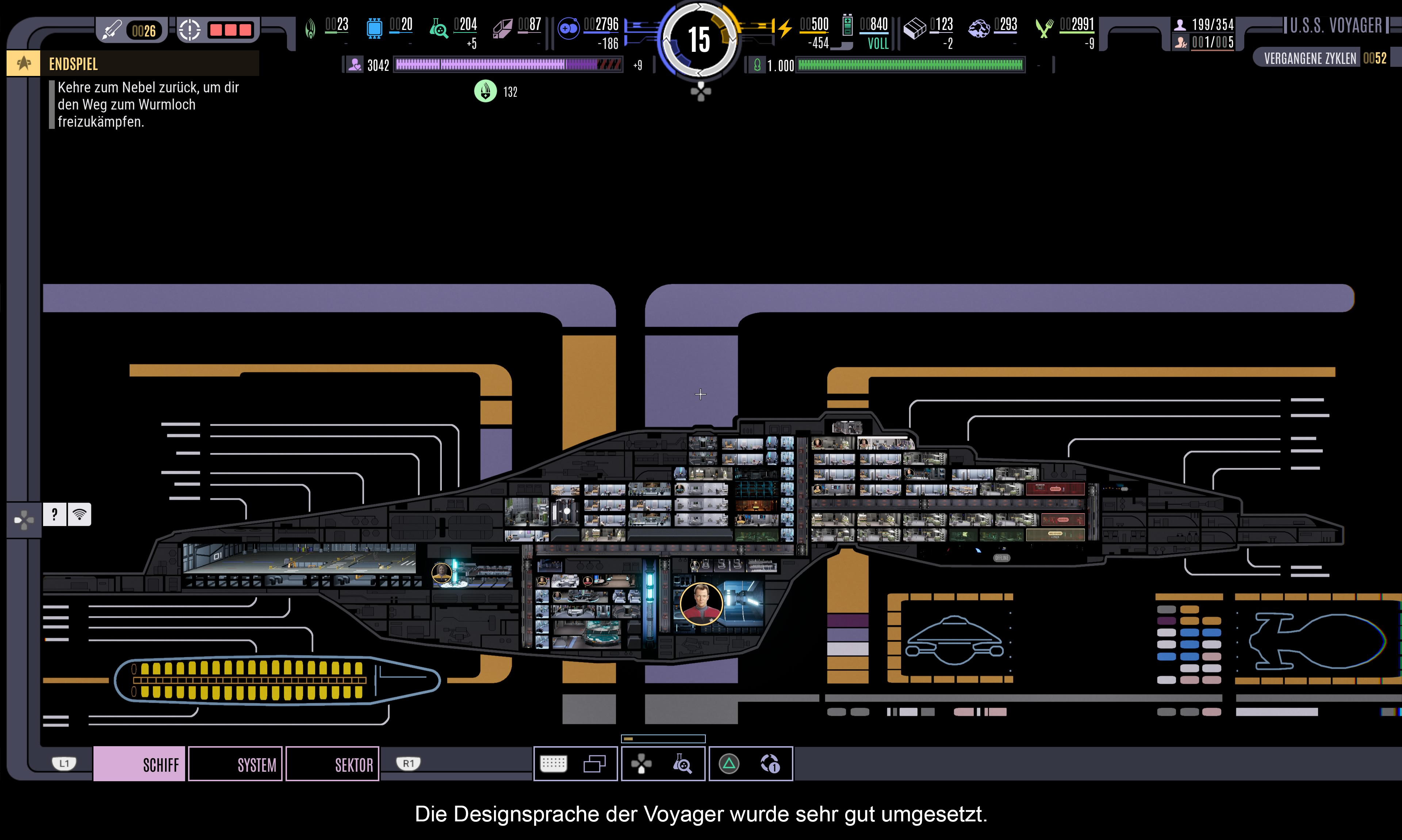 Zwar werkelt im Hintergrund die Unreal Engine 5, aber von Lumen und Naniten merkt man hier nichts. Grafische Highlights findet man hier nicht viele. Die Figuren sind ordentlich modelliert, jedoch fehlt eine gewisse Nähe zum Original. Auch die Umgebung und Kampfbildschirm kann mit einigen netten Elementen überraschen, wenn man nah genug heranzoomt. Jedoch bekommt man davon wenig während des Spielens mit. Zumindest wurde das Design der Star-Trek-Sprache angepasst und viele der kleinen Nuancen helfen über die Schwächen hinwegzusehen. Jedoch macht es die sehr zähe Präsentation schwer der Handlung zu folgen. Oft wird diese nur in Textfenstern erzählt oder einen Ausschnitt von der Brücke oder Krankenstation, wo die agierten Figuren stehen. Hier und da gibt es eine kurze Zwischensequenz, aber auch die ist kein Highlight. Akustisch ist das Voyager-Thema am Anfang das Highlight. Während der Reise gibt es passende und ruhige Star Trek Hintergrundmusik. Das vertraute Star Trek Piepsen und die Suren des Warpreaktor hilft bei der Emersion. Sprachausgabe gibt es während der Missionen nicht, nur am Start eines Sektors gibt es einen unterhaltsamen Logbucheintrag von Tuvok oder Tom Paris, vertont von den Originalsprechern.