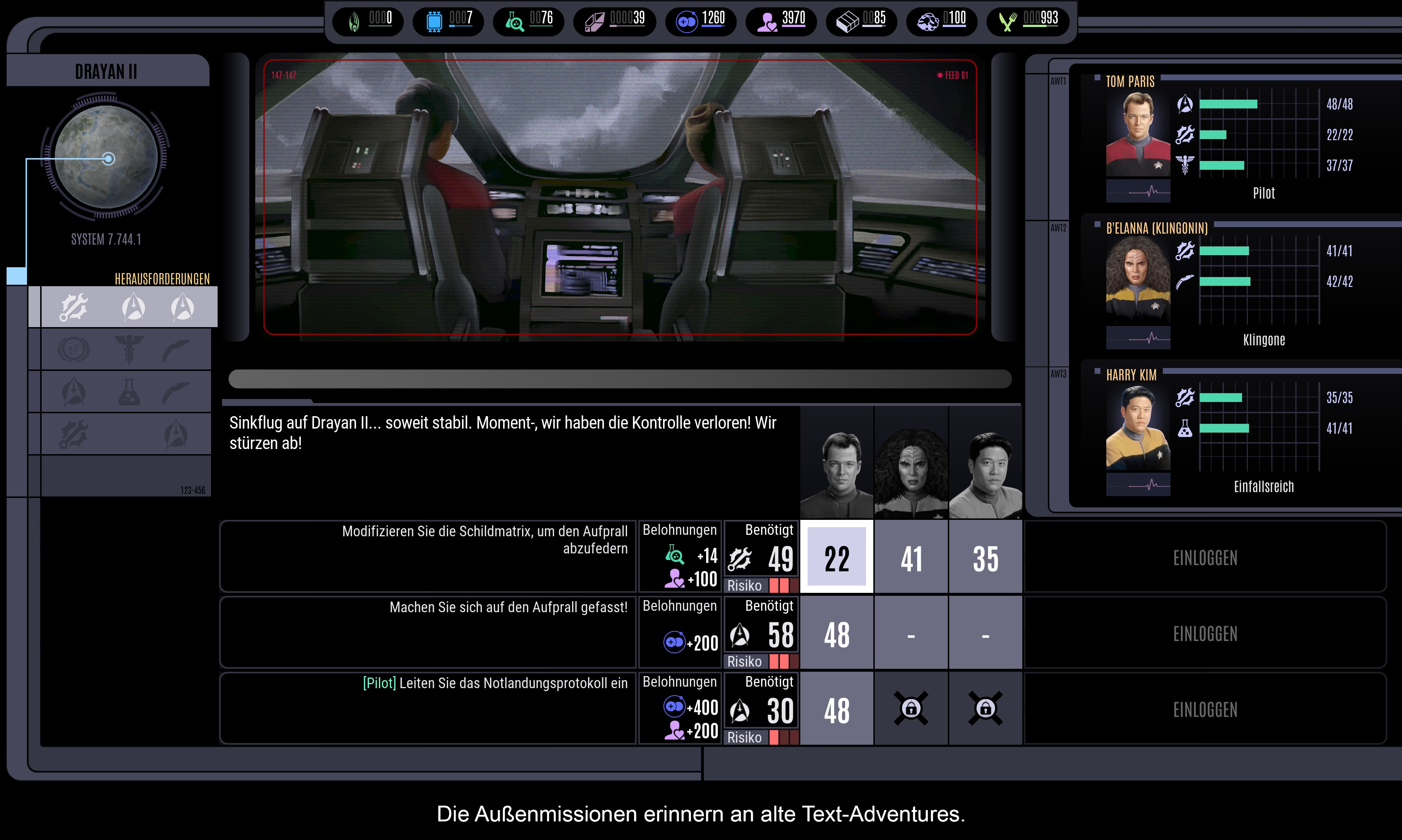 • Außenmissionen: Man schickt bis zu drei Mitglieder mit unterschiedlichen Stärken los. Das Spiel zeigt fair an, welche Skills benötigt werden. Der Einsatz selbst wird über ein Textfenster und Zufallsereignisse gelöst. Erfolgreiche Missionen steigern das Level des Mietglied und bringen auch zusätzlich Materialen. Dieser Teil lässt sich am besten mit alten Text Adventure vergleichen.